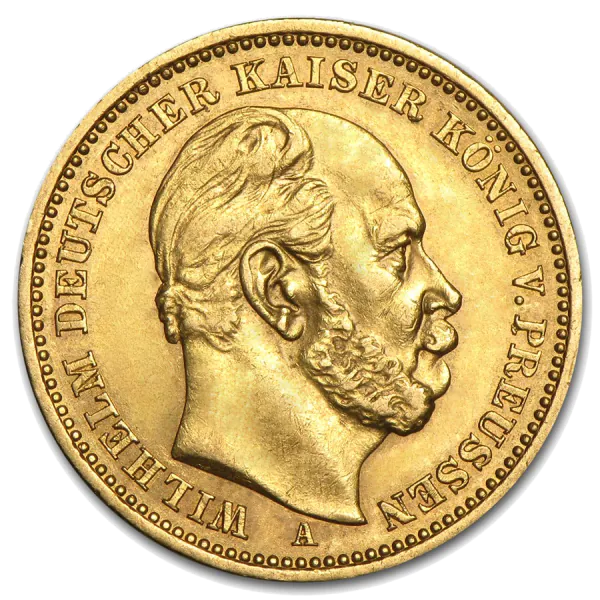 Ce dernier étant devenu cinquième Roi de Prusse après les guerres sous l’empire de Napoléon III, et premier empereur de la confédération germanique (1871 - 1888), il instaure en 1873 le Reichsmark comme nouvelle monnaie pour l’esemble des membres de l’empire. Le 20 Reichsmarks en Or est une des pièces les plus vendues en Allemagne.